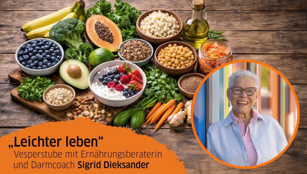 Sigrid Dieksander ist zertifizierte Ernährungsberaterin und Darmcoach. Und Reinhard Bretträgers Schwester 🙂 Bei unserer ersten Vesperstube im neuen Jahr erklärt sie uns in ihrem Vortrag, welche Lebensmittel und Gewohnheiten den Körper unterstützen. Wie kleine Veränderungen zu mehr Wohlbefinden, Beweglichkeit und innerer Leichtigkeit führen – ganz ohne Diät-Gedanken! Entdeckt gemeinsam mit uns, wie wir unsere Gesundheit nachhaltig verbessern und unsere Ernährung leicht und genussvoll wird.